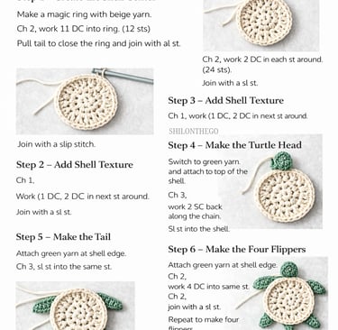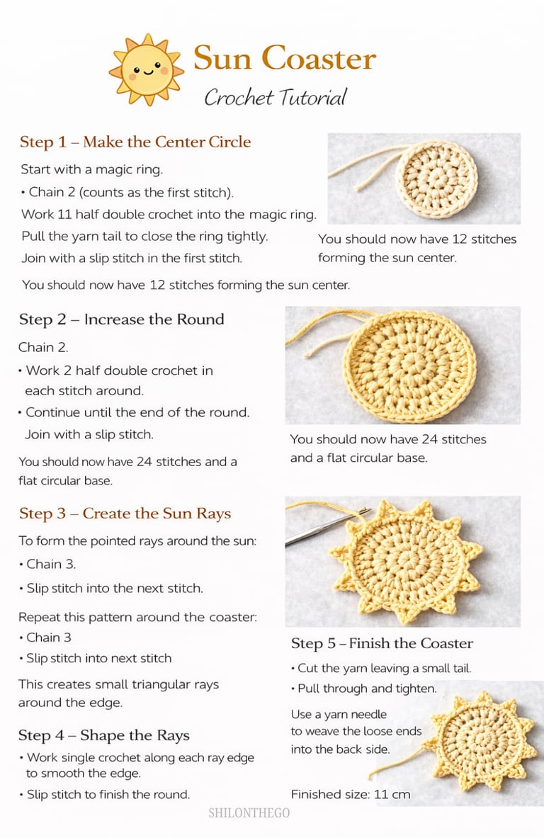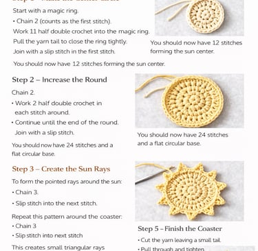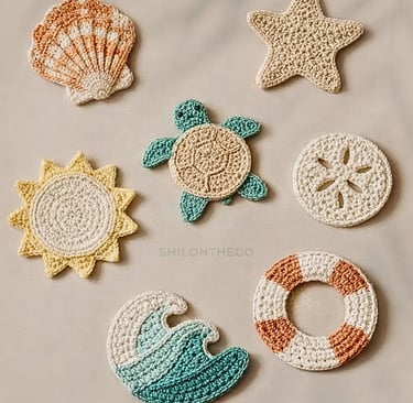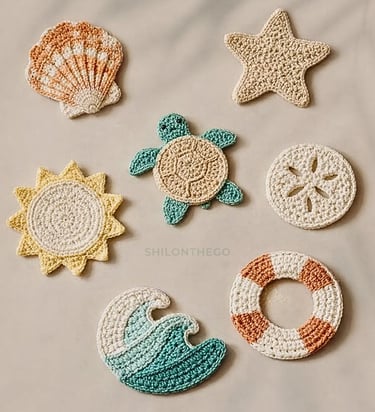Create a beautiful ocean-inspired coaster set with this Sea Creatures Crochet Pattern. This fun project includes cute designs like a starfish, seashell, turtle, wave, sun, and lifebuoy, perfect for beach-themed decor. π